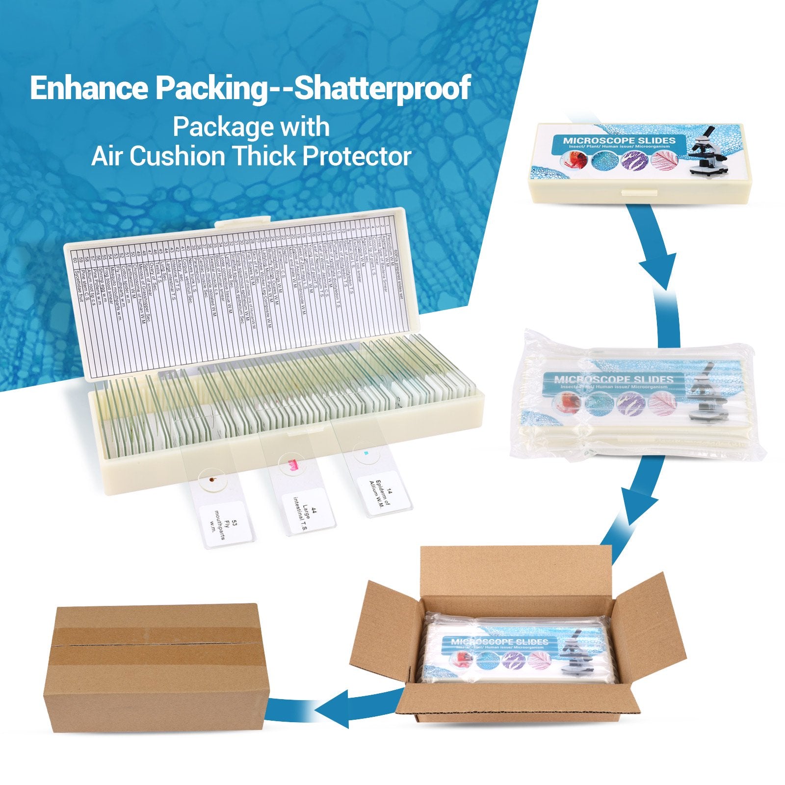 【Protective Packing】The prepared microscope slide set in multi-layers package, with protective sponge, plastic box, and condensed cardboard tray outside. If any piece is broken or lost upon receipt, please contact us for resend or full refund.