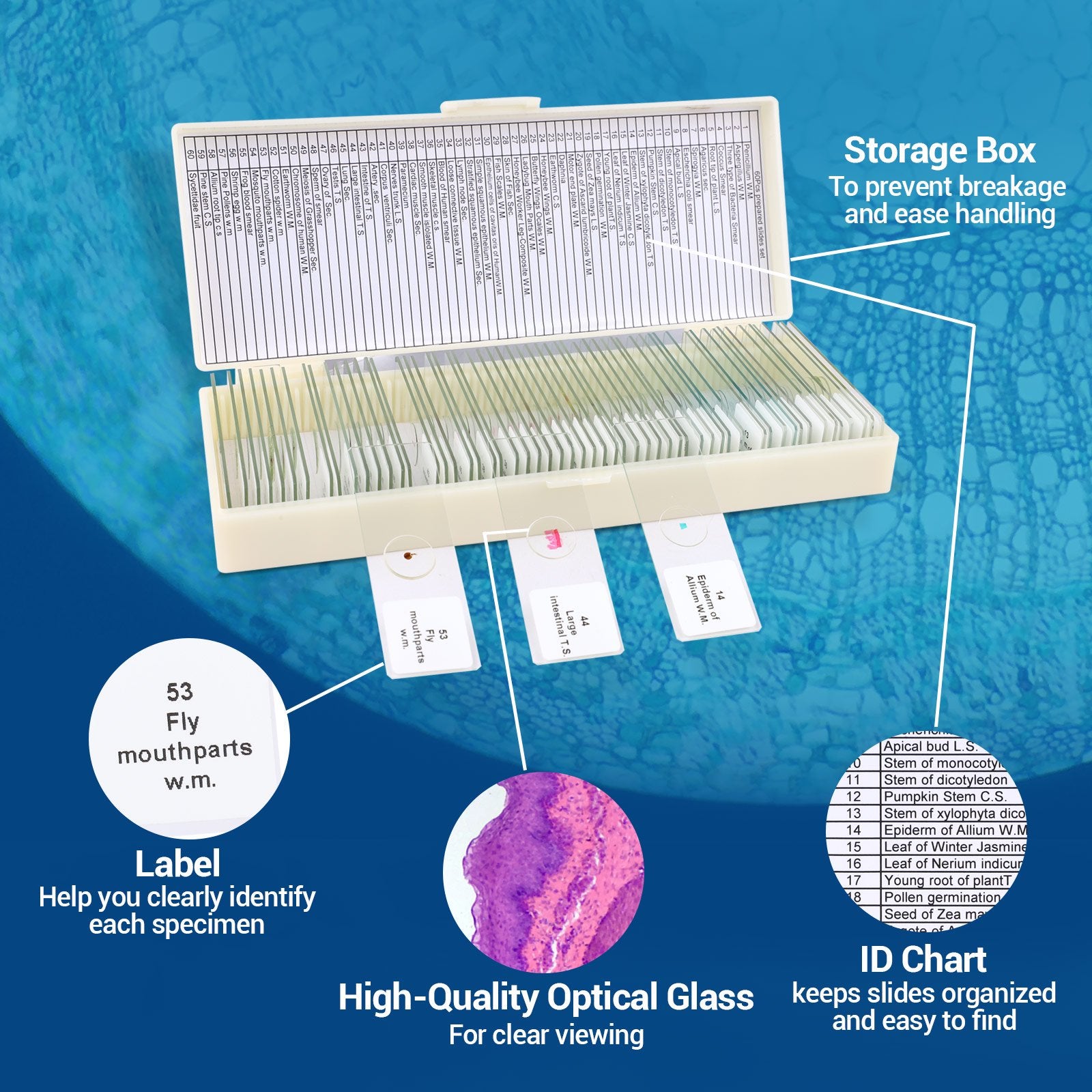 LAKWAR 60 Prepared Microscope Slide --The slides for microscope with standard dimensions: 1" x 3" (25mm x 75mm) in size and universally fits most microscopes, whether professional microscopes, student microscopes, adult microscopes, or children's microscopes. The prepared microscope slide sets including plants, insects, and animals and humna tissue, 120 Pcs in total, multiple choices is perfect for biological education and enlightenment of scientific interests.Each slides is labled with name and come with a list of slides included, you dont worry about the problem of getting confused about the sample. The slides made of high-quality transparent glass, edge of each slide has been carefully polished and wrapped, not sharp to prevent scratches.Each slide has a separate card slot, which is used to fix the section and prevent the section from rubbing or breaking.If you're feeling wobbly about picking the right biological slide right now, choose LAKWAR!Step into a clearer and professional microscopic world, and explore the mysteries of biology and nature.