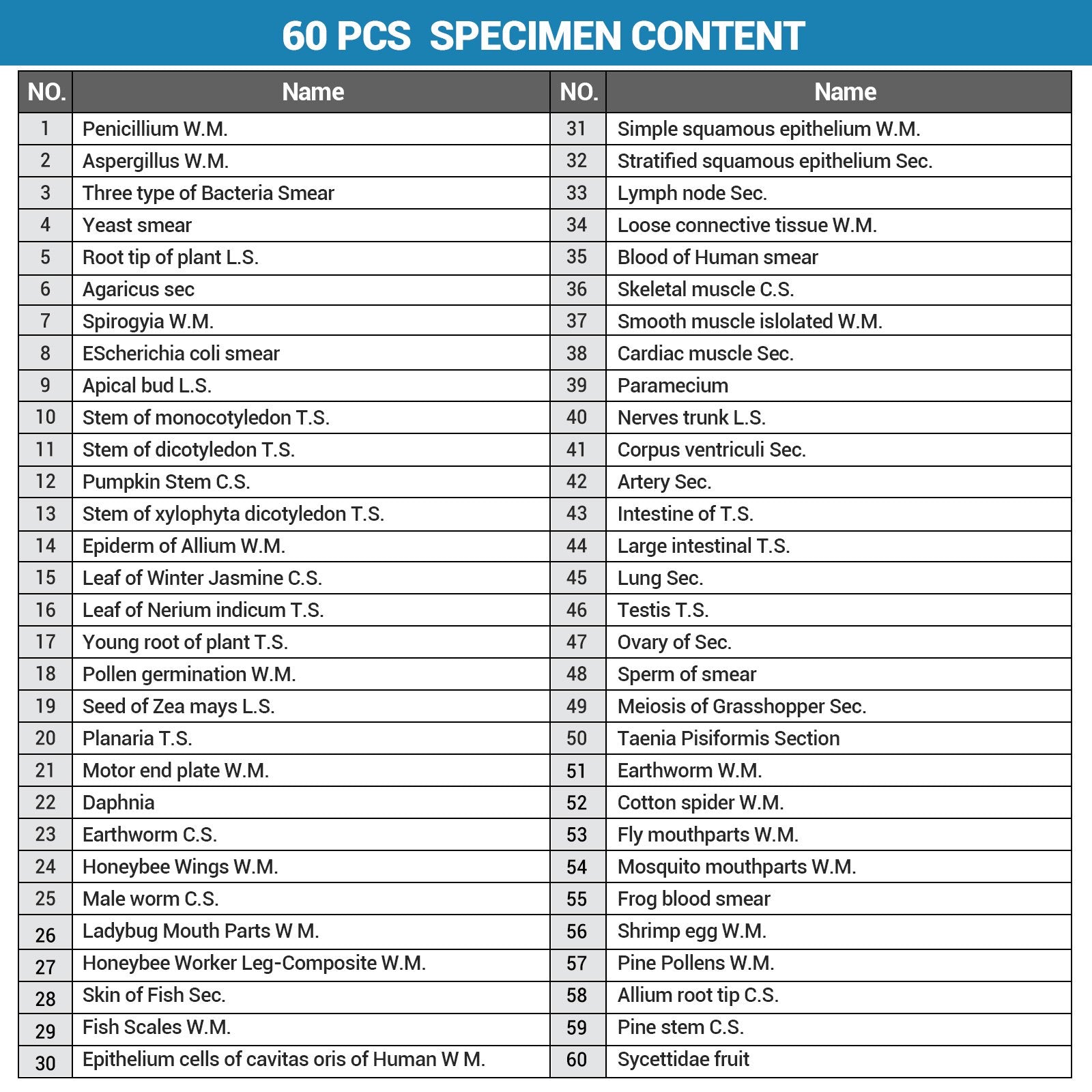 Microscope Slides SpecimensTotal: 60 pcsHuman Being Tissues & Cells: 20 pcsPlants Organs & Tissues: 18 pcsInsects & Other Little Animal: 17 pcsMicroorganism and others: 5 pcs