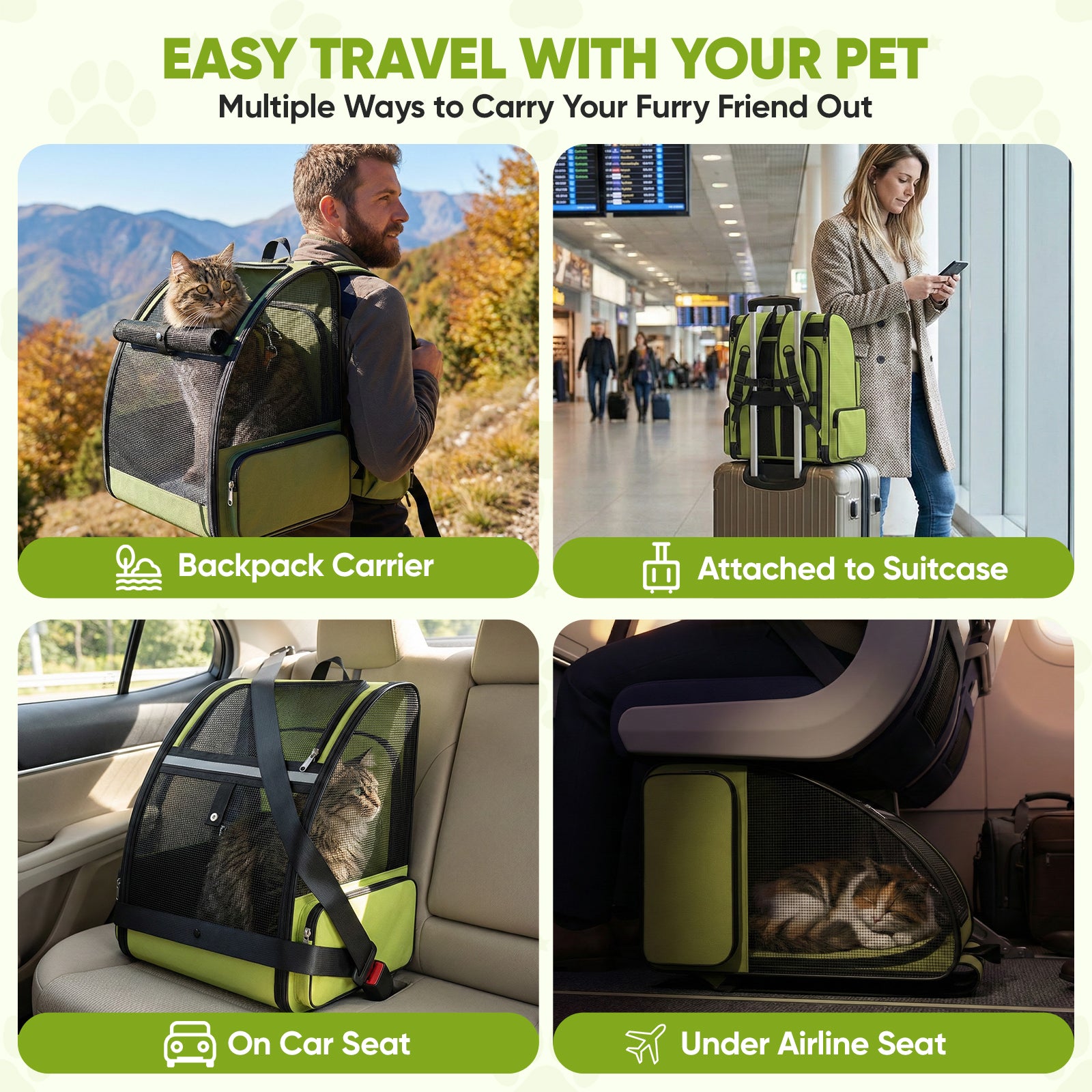 Cat Carrier Backpack Expandable Ventilated Pet Carrier for Large Cat Puppy Outdoor Travel Backpack with Breathable Mesh, Green