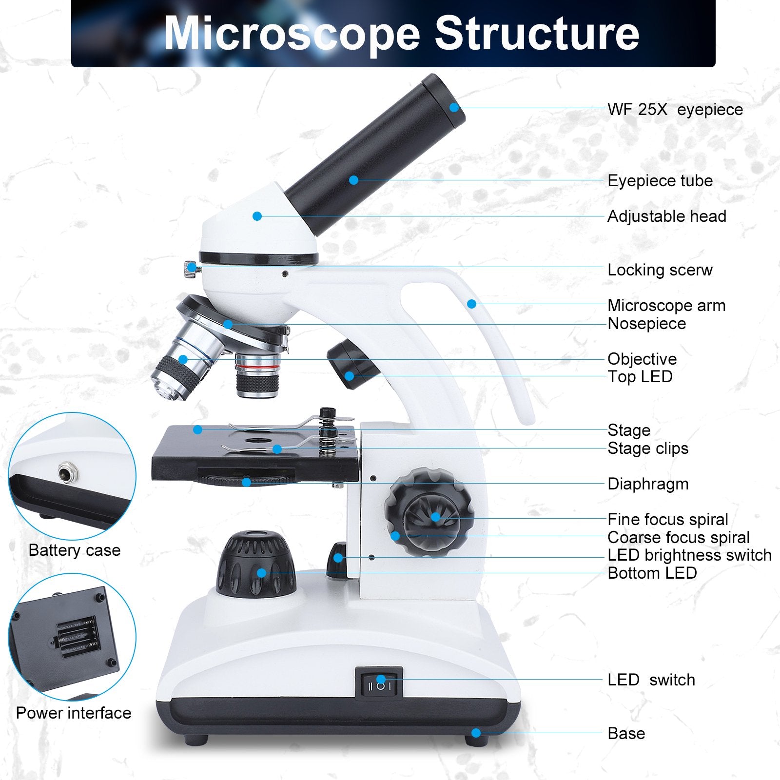 - 【2 Cordless LED Light】 Microscope phone adapter. The double light high power microscope has incident and transmitted LED light sources, which can see both opaque objects illuminated from above and translucent specimens illuminated from below.