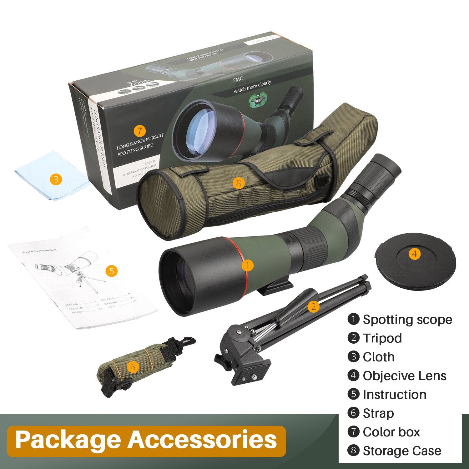 【Full range of accessories】The spotting scope with tripod for steady observations. The carry case, eyepiece and lens protection covers, cleaning cloth make it more convenient to carry and maintain for outdoor and indoor use.