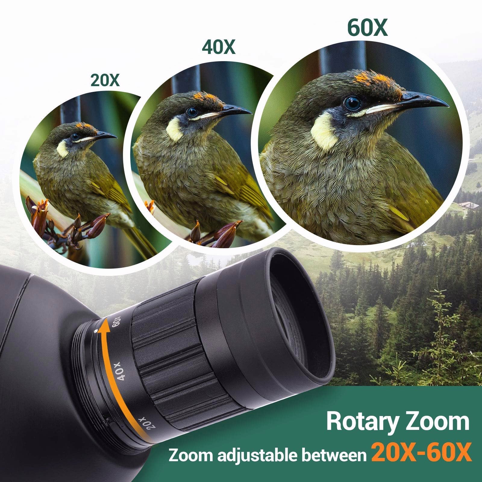 - 【20x-60x Power Magnification】This spotting scope features a powerful zoom magnification range that adjustable 20x to 40x and 60x magnification,45 degree angled eyepiece ergonomic design allows more comfortable viewing. brings nature closer to you than ever. Perfect for bird watching wildlife, target shooting, hunting, spotting moon, traveling, hiking, camping, archery, astronomy etc