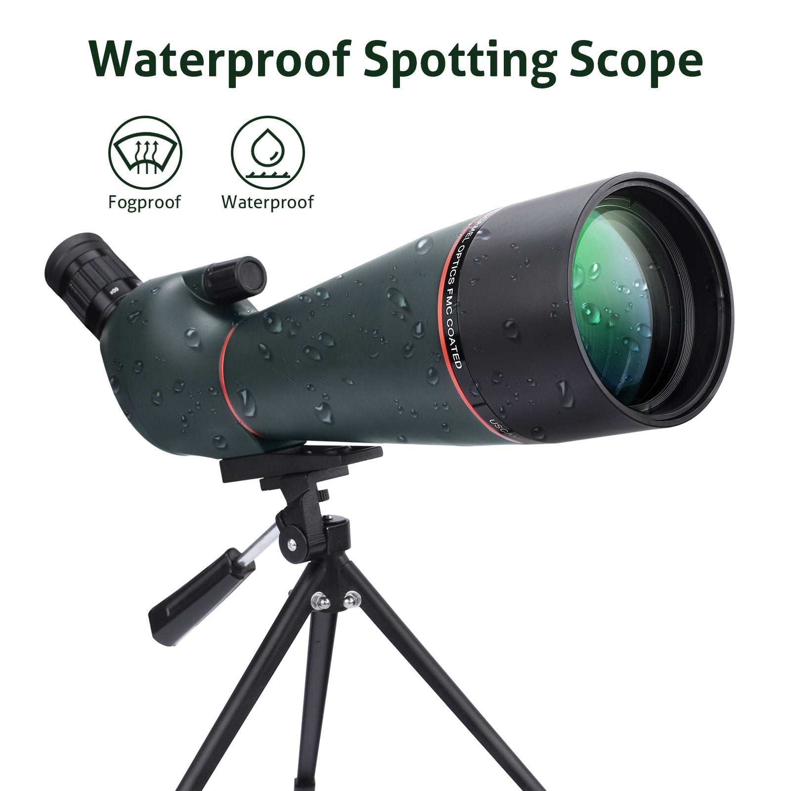 - 【Waterproof & Fogproof】The waterproof spotting scope provides exceptional performance in the most rugged conditions. the spotter scope optics are sealed with O-rings to prevent moisture, dust, and debris from getting inside the spotting scope, fogproof barrel is filled with nitrogen gas to inhibit internal fogging, completely protection for all weather conditions