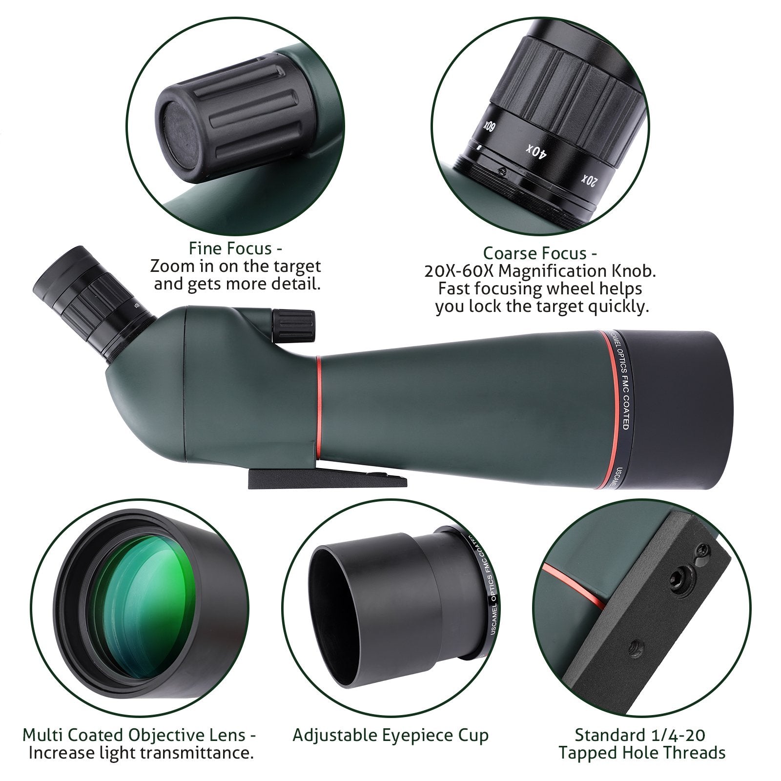 - 【20x-60x Power Magnification】This spotting scope features a powerful zoom magnification range that adjustable 20x to 40x and 60x magnification,45 degree angled eyepiece ergonomic design allows more comfortable viewing. brings nature closer to you than ever. Perfect for bird watching wildlife, target shooting, hunting, spotting moon, traveling, hiking, camping, archery, astronomy etc
